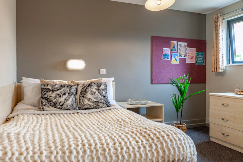 A self-contained studio with a fully-fitted kitchen, comfy double bed with under-bed storage, generous study area, en-suite shower room, a wardrobe, drawers, and shelves.