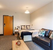 Our Premium Studios measure 31m2 and are light and airy making them a great choice for those wanting to live independently. Fully furnished with a small double bed, 2 double-sized wardrobes, a study area with a desk and chair, tons of storage, and your own ensuite shower room you’ll love your student living space. The fully fitted kitchen comes with a hob, oven, under-counter fridge/freezer, and a breakfast bar to eat at or invite friends over.