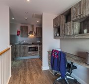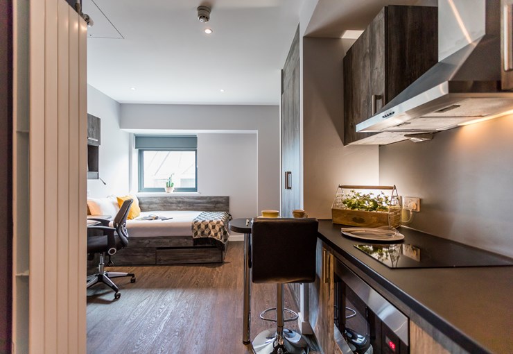 Each comes complete with a private ensuite wet room, plenty of wardrobe and under bed storage, study space and a fully fitted kitchen. These are our standard size studio rooms.