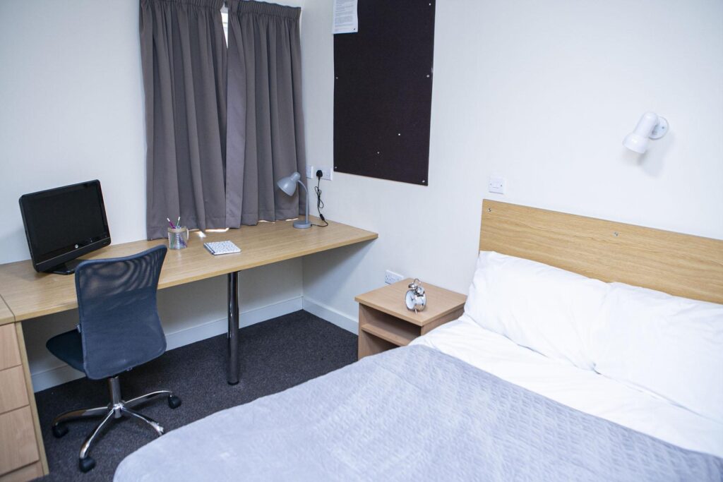 This room prioritizes functionality and comfort with a spacious ¾ double bed, a large wardrobe for extra storage, your own bathroom and a desk and chair set up for you to study. The rooms are furnished with modern home decor pieces that lend a cozy atmosphere to your room. The friendly atmosphere fosters community spirit among students who feel encouraged to mingle with their peers staying at Rochester Student Village.