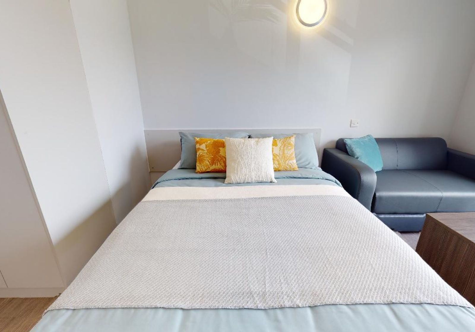 STQU300-031125Upgrade to a small double bed, with private bathroom, hardwood floors, study desk and chair and plenty of storage in 15 sq m of space. As well as your own private space, you’ll be sharing a spacious open-plan living room and kitchen with 3-6 flatmates, with great cooking facilities, TV, sofas and dining table and chairs. You’ll also have use of the building’s gym, courtyard and barbecue area.