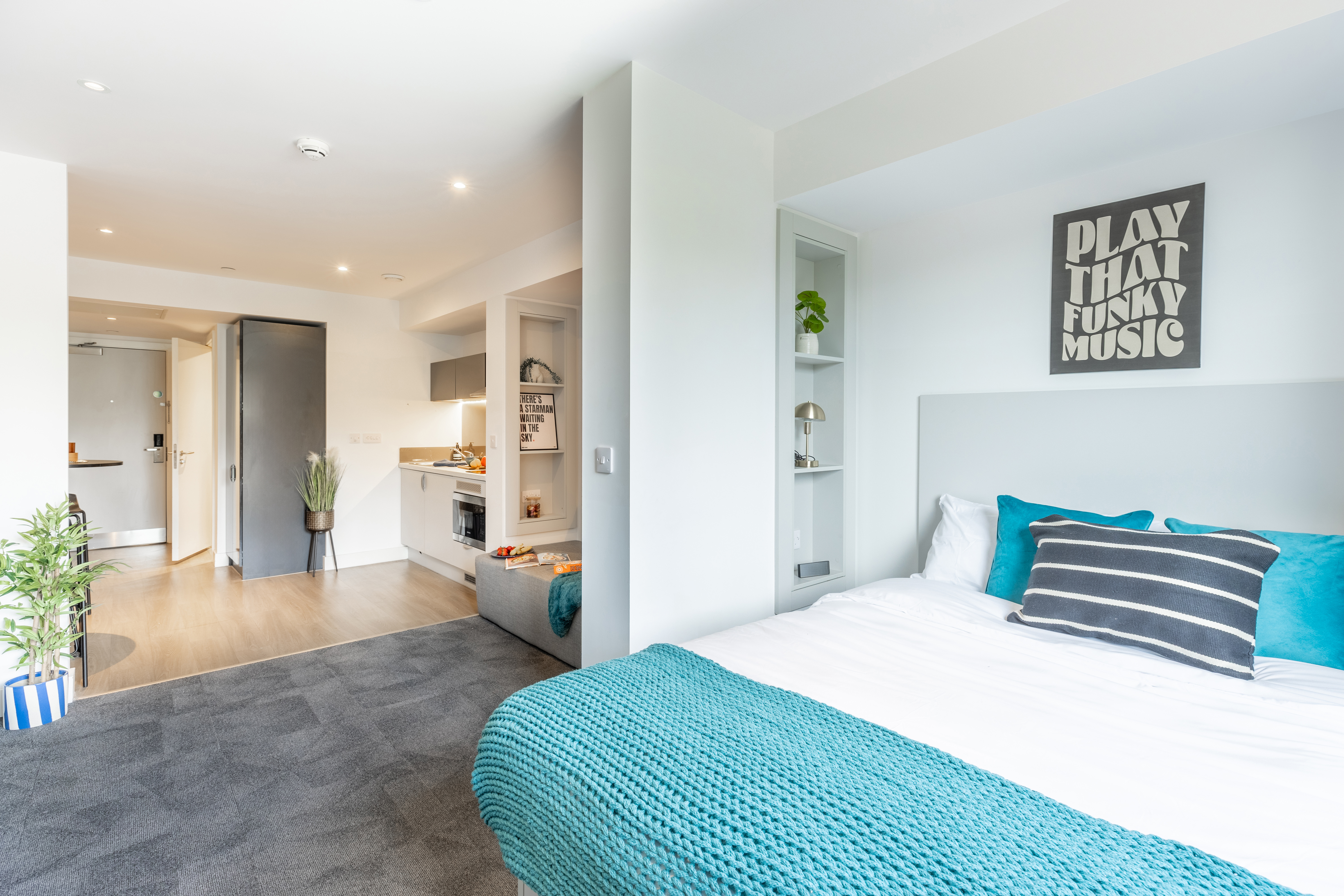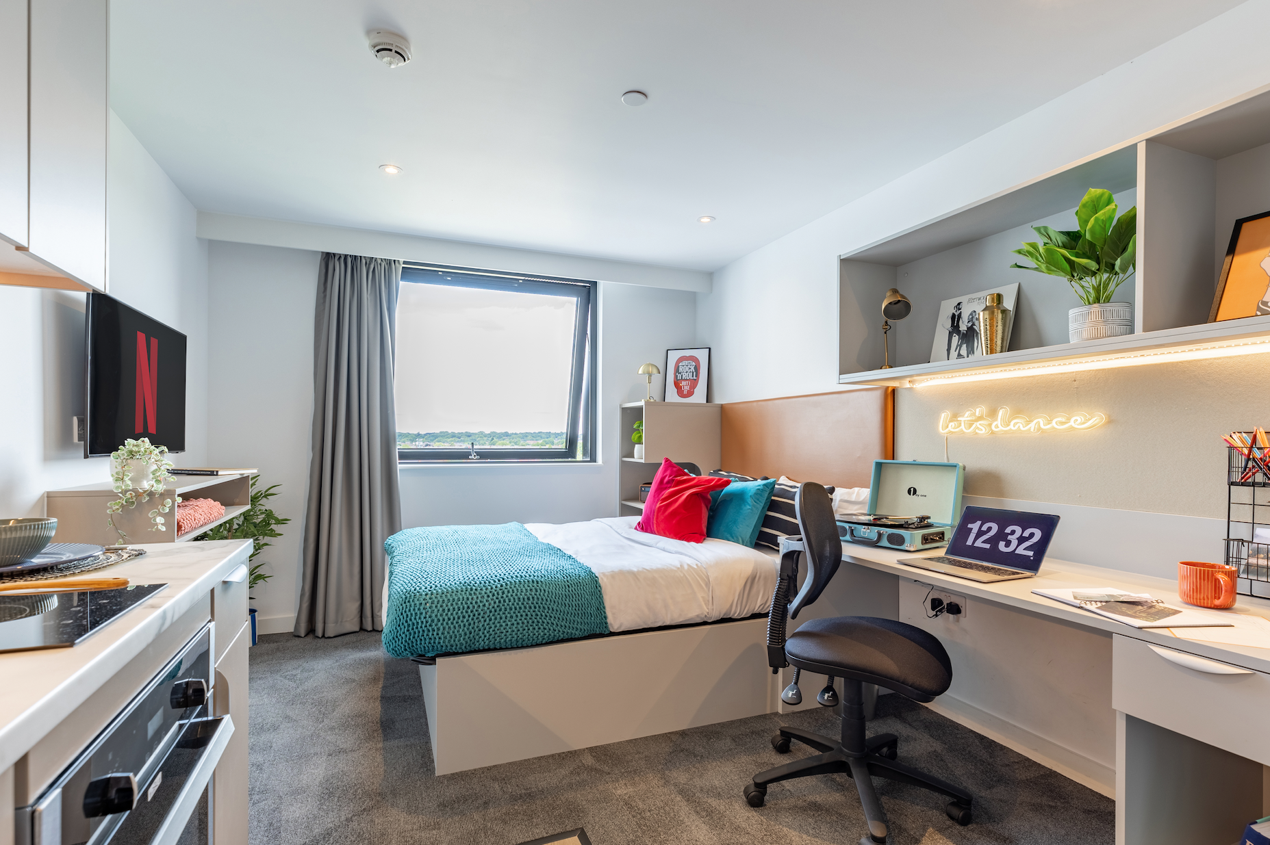 Our studio plus rooms at true Salford each contain a double bed, kitchenette and ensuite shower room. Everything you need in a comfortable, luxurious private living space.