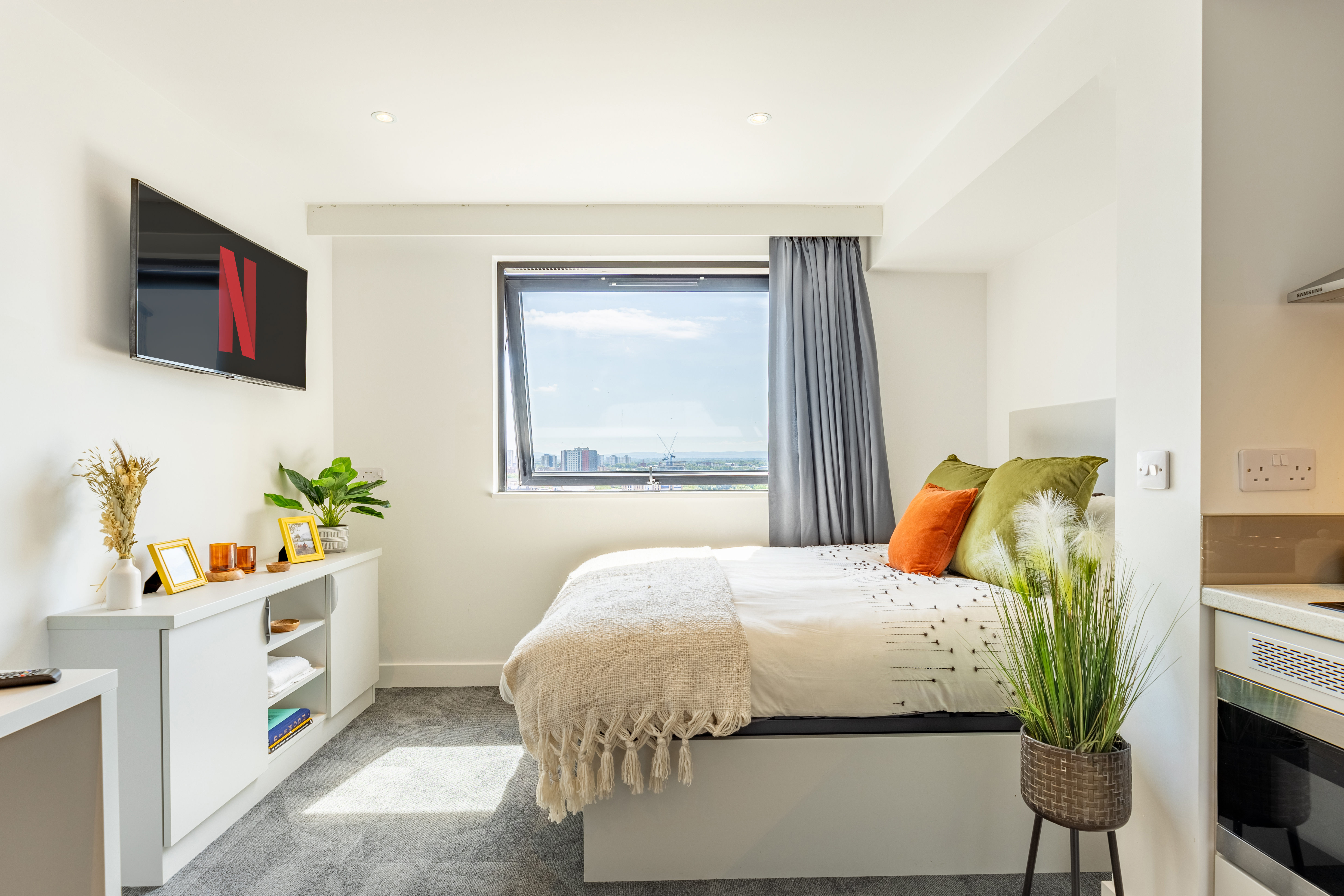 Our sky studios are situated on our top three floors, where you'll find the best views of MediaCity! Each room contains a double bed, kitchenette and ensuite bathroom. At 20sqm, our bright and airy sky studios provide plenty of storage space.