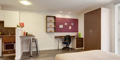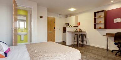 Communal kitchen, your own bathroom and living space shared with 3-6 students 14.04 – 17m2 approximately Small double bed En-suite bathroom with shower toilet and basin Under-bed storage, desk, chair, wardrobe and chest of drawers