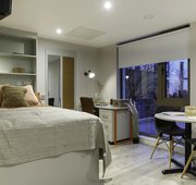 Room sizes may vary from 11.7m2 18.2m2 - Levels 1 - 9 - size double bed with under bed storage - Private en-suite shower room - Study space with desk and chair - Bedside table - Blackout blind - Coat hooks - Dining area - Mirror - Peg board - Private kitchen with induction hob, microwave oven, and fridge freezer - Private room access - Shelves - Study space with desk and chair - 32 TV - USB sockets - Wardrobe - Whats in the shared kitchen and dining area? - Four ring induction hob - Integrated combination oven - Full-sized fridge freezer - Dining space with table and chairs - Lounge / Sofa area - 50 TV in sofa area