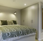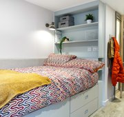 Room sizes may vary from 11.7m2 – 18.2m2 ¾ size double bed with under bed storage Private en-suite shower room Study space with desk and chair Bedside table Blackout blind Coat hooks Dining area Mirror Peg board Private kitchen with induction hob, microwave oven, and fridge freezer Private room access Shelves Study space with desk and chair 32″ TV USB sockets Wardrobe