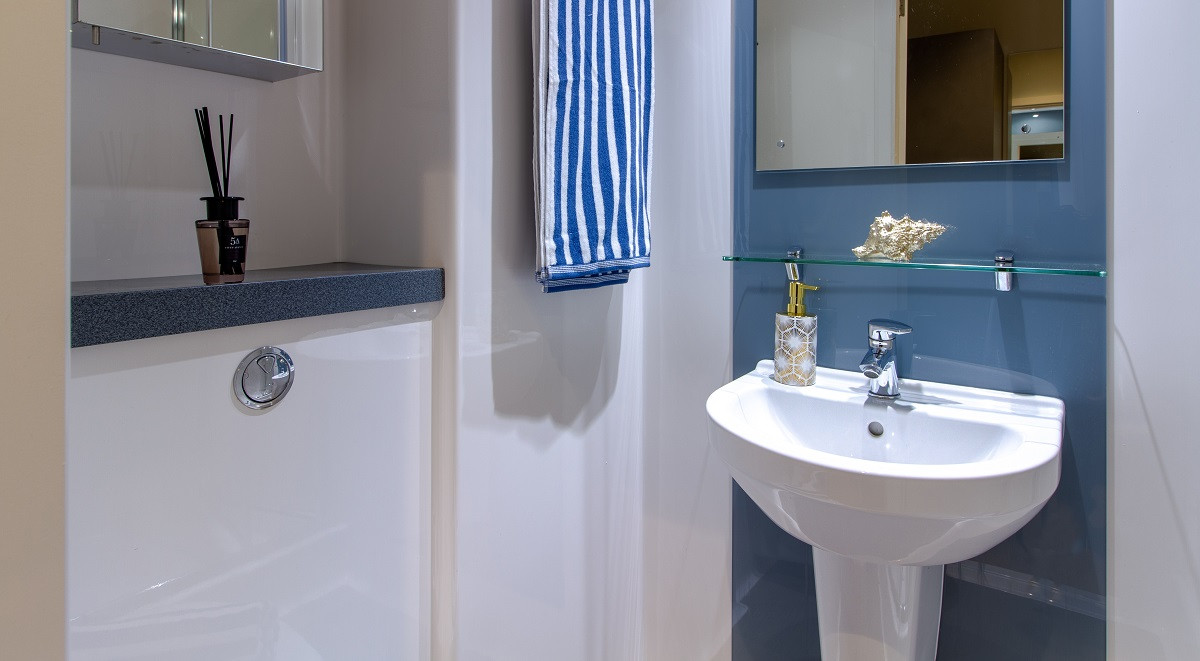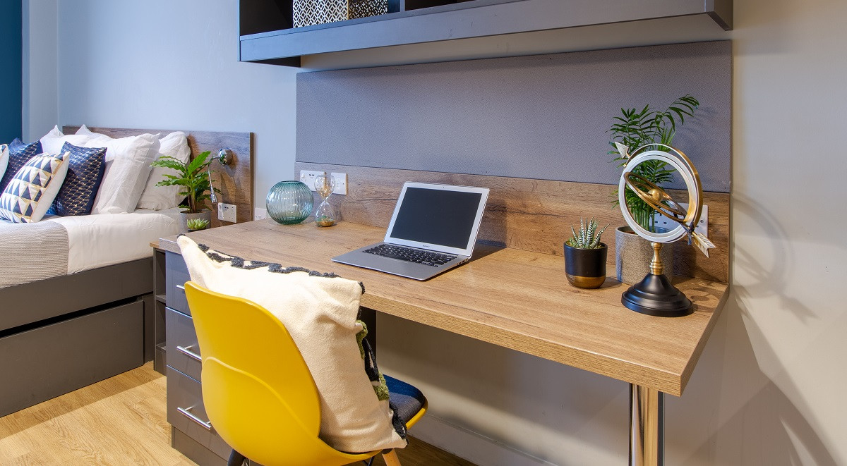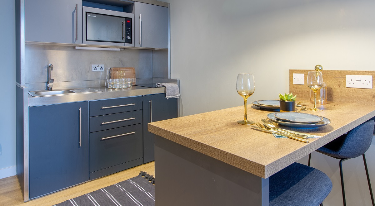 The largest of our studio apartments, this 40m² luxury student flat includes all the amazing furnishings and benefits of the Prestige Studio, in an even more spacious and airy apartment. With a generously sized bed, a bedside table, and a desk featuring built in USB sockets. The kitchen area features a combi oven, 2-ring hob, fridge/freezer, dishwasher and a dining table. The living space is kitted out with a 2-seater sofa and a 32” TV, and the study space includes a desk (with handy built in USB charging sockets) and a desk chair. A large bathroom with walk in shower completes the Prestige Accessible Studio.