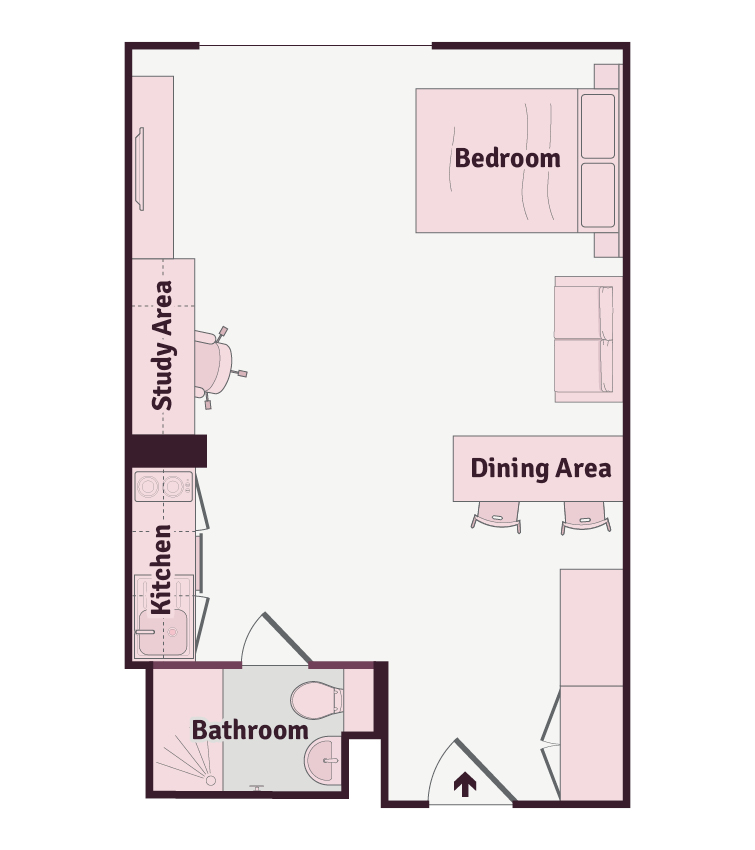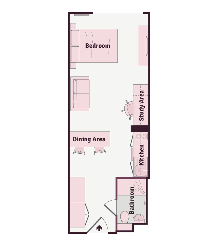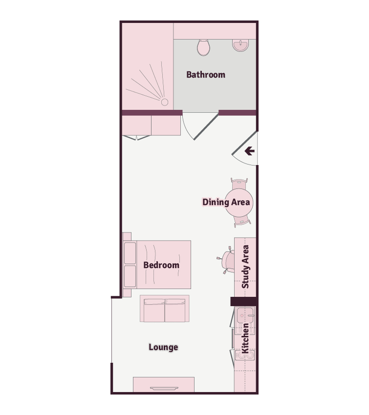 The largest of our studio apartments, this 40m² luxury student flat includes all the amazing furnishings and benefits of the Prestige Studio, in an even more spacious and airy apartment. With a generously sized bed, a bedside table, and a desk featuring built in USB sockets, The kitchen area features a combi oven, 2-ring hob, a fridge/freezer, a drawer dishwasher and a dining table bar. The living space is kitted out with a 2-seater sofa and a 32” TV, and the study space includes a desk (with handy built in USB charging sockets) and a desk chair. An en-suite with a shower completes the Presidential studio, and of course you have access to all the great residents-only benefits at Crown House, like on-site events and a private cinema!