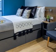 A luxurious 32m² student apartment, this modern, stylish and spacious studio provides market-leading quality and comfort to our residents. With a double bed, bedside table, wardrobe & drawers, you have lots of storage space, while the kitchen is equipped with a combi oven, 2-ring hob, a fridge/freezer, a drawer dishwasher and a breakfast bar. Your living space is kitted out with a 2-seater sofa and a 32” TV, and the study space includes a desk with desk chair, USB ports and pin board. Finally, an en-suite with shower rounds out the studio, and you have access to all the great residents-only benefits at Crown House, like on-site events and a private cinema!