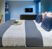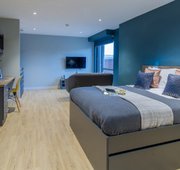 Our Premium Superior Studio has everything you’ll need to live a life of luxury whilst at university measuring 20m2. This room style features a double size bed, bedside tables, wardrobe and drawers, 32” TV, desk chair and desk with USB ports so you can have the ultimate study space at home. Along with large windows bringing in plenty of natural daylight. Within the kitchen area is all the amenities needed with a microwave/oven, induction hob, fridge/freezer and breakfast bar. This room style has a modern fully fitted en-suite with shower.