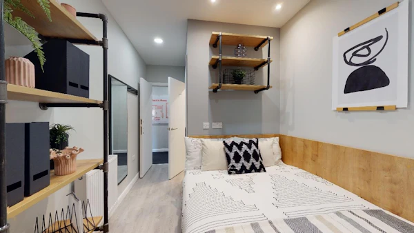 The room sizes can vary, ranging from 12m² to 20.70m². Each room features a standard double sized bed with under bed storage, an en-suite bathroom equipped with a shower and WC, a full-length mirror, a pinboard, a study desk with drawer space, a chair, and a wardrobe. In the shared kitchen, you’ll find a 4-ring hob with an extractor, an electric oven, a full-size fridge freezer, and a shared dining table with chairs.