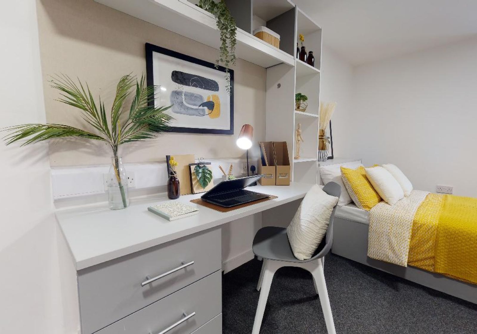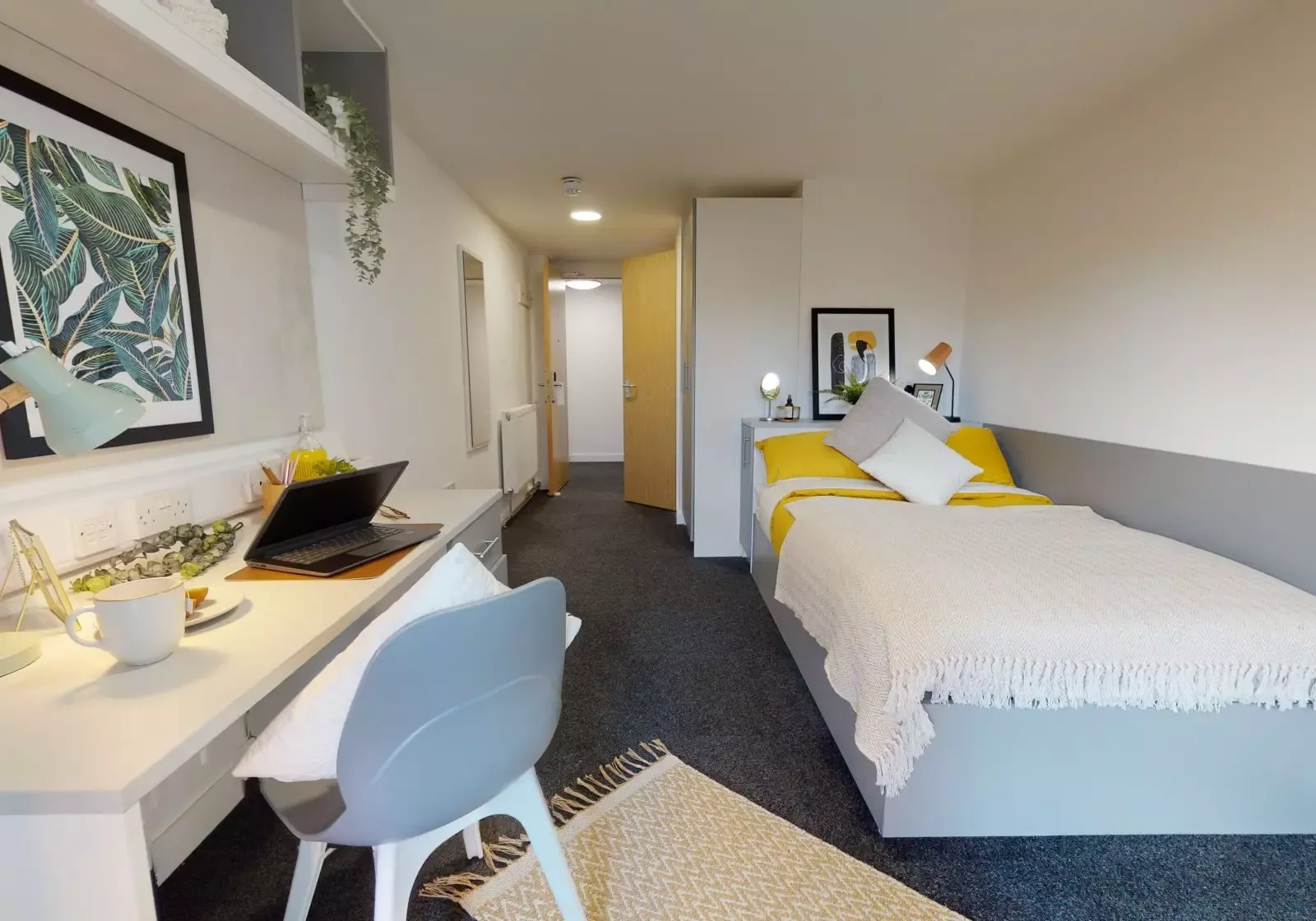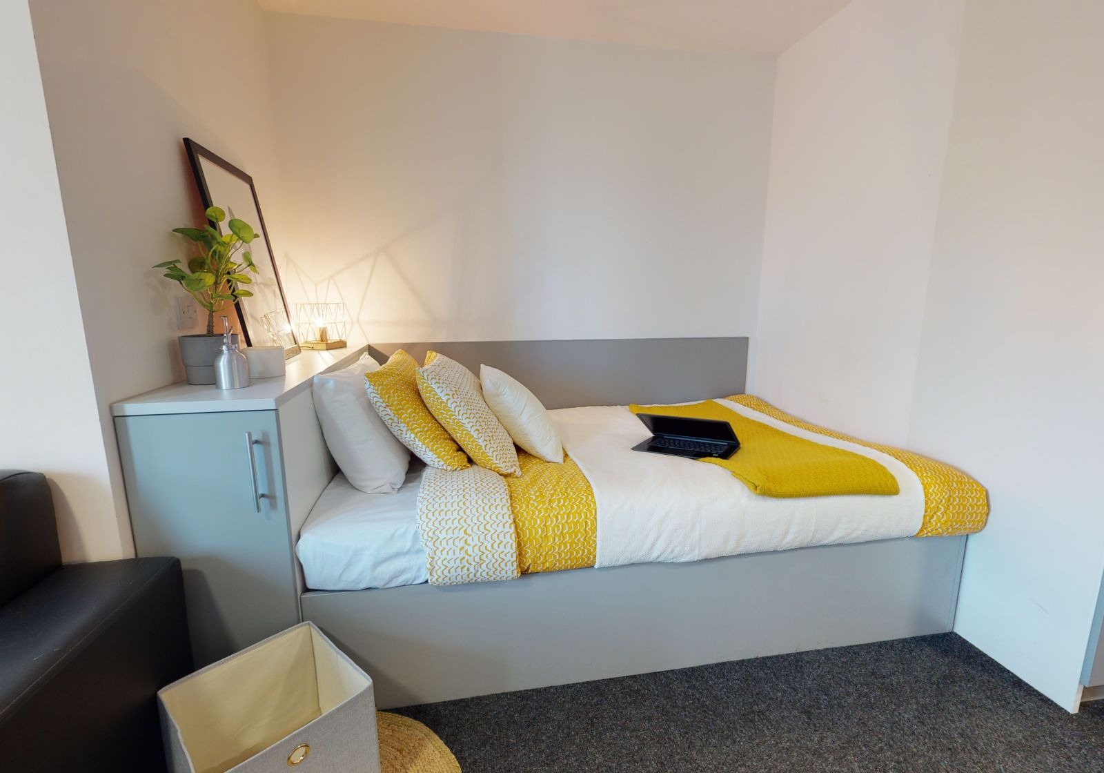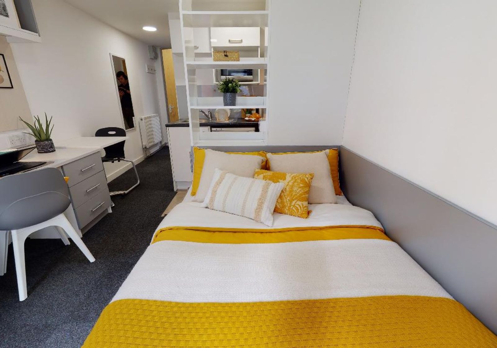 CENT200-031125With all the same great features as our Silver Studios but with stunning views over Sheffield from their 9th-floor location, these rooms have a luxurious feel. With 19 sq m of space, these self-contained rooms give you a small double bed, separated from the kitchen by a stylish wall divider and storage unit. Floor-to-ceiling windows give lots of natural light, and you have your own study desk and chair and other storage options. You still get use of great building features like gym, cinema room, social spaces and study room.