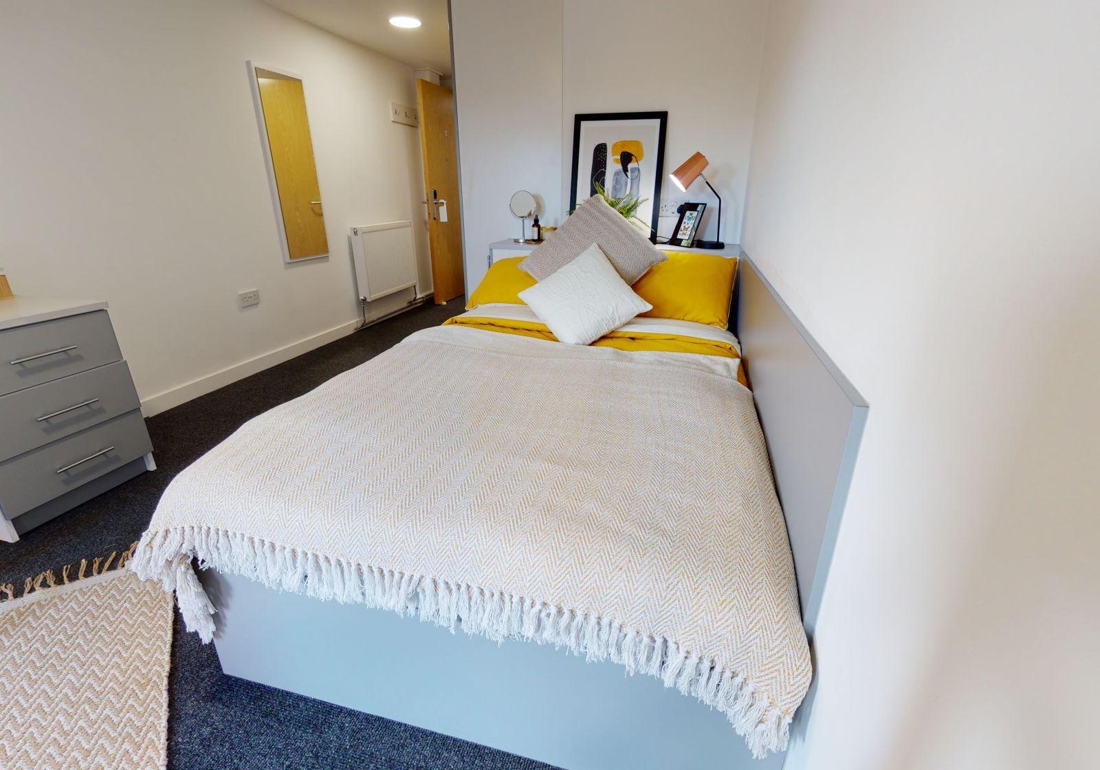 CENT200-031125Our entry-level rooms on floors 0-8 in Century Square have a bright, modern feel, a private bathroom, small double bed, study area and lots of storage As well as the privacy of your room, you’ll enjoy a social vibe from sharing a spacious open-plan living room and kitchen with your flatmates. With a 40” smart TV, all the cooking equipment you need, a breakfast bar with slick stools and comfy sofas, it’s well kitted-out. You also get to the enjoy the building’s cinema room, gym, social spaces and study room.