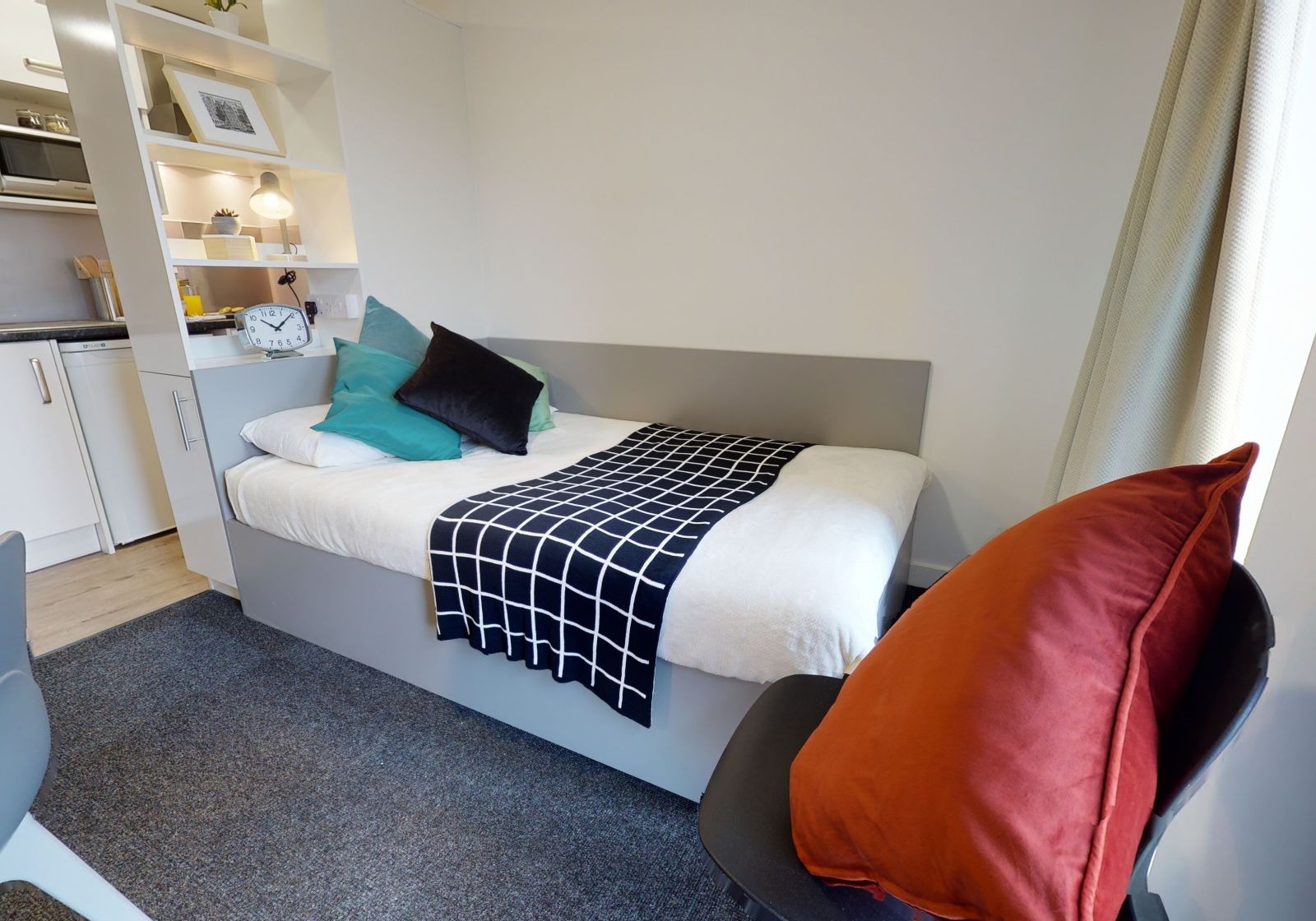 CENT200-031125If you’re looking for more privacy and functionality, these excellent entry-level studios are great value for money with private kitchenette and bathroom as standard. Located on floors 1 through to 6 with 17 sq m of space, these self-contained rooms give you a small double bed, separated from the kitchen by a stylish wall divider and storage unit. Floor-to-ceiling windows give lots of natural light, and you have your own study desk and chair and other storage options. You still get use of great building features like gym, cinema room, social spaces and study room.