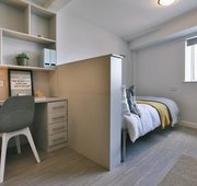 FENT200-031125No need to compromise with these great value, 13.5 sq m entry-level rooms, offering a small double bed, private bathroom, and contemporary look and feel with hardwood floors. With a good amount of space and storage and a study desk and chair, your room is perfectly formed. You’ll share a big, modern, open-plan living room, kitchen, and dining area with your flatmates, equipped with TV, comfy sofas, and all the cooking essentials.