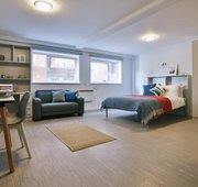 FENT400-181124For those wanting a seriously spacious room with dedicated living and study space, these enormous studios are a cut above the rest. These huge, airy 31 sq m rooms have lots of natural light and a contemporary look and feel with hardwood floors. Your private bathroom, full-size double bed and fully fitted kitchen are all spaciously separated to give the feel of a proper apartment. You also get the social benefits of the building too and use of the onsite laundry.