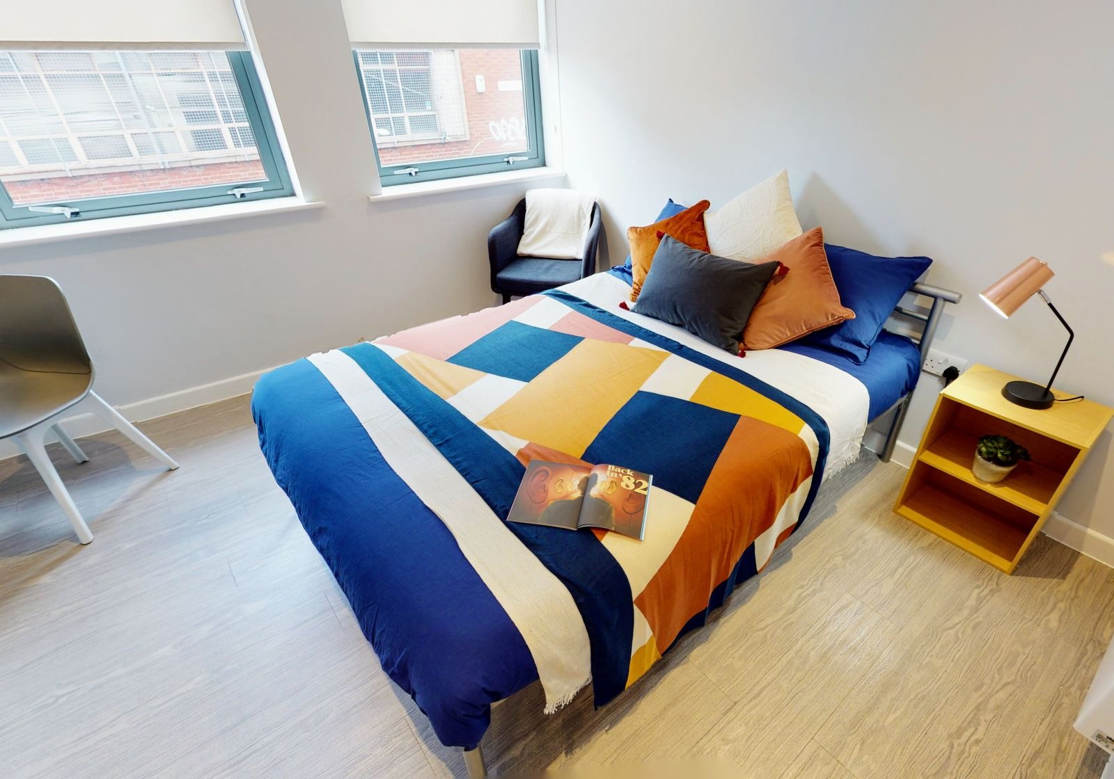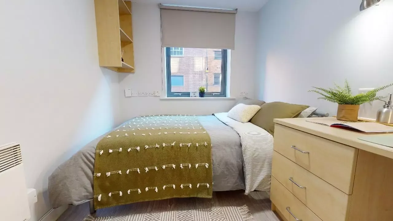 BROC350-051125Our contemporary entry-level rooms include a private bathroom and small double bed, giving you great value for money. Located on the top floor your room comes with plenty of storage, hardwood floors and a study desk and chair. Your modern open-plan kitchen and living space are shared with up to 6 others, and with breakfast bar, comfy sofas and TV make for a great social vibe.