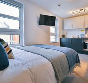 STEE200-031125These smart, modern, refurbished studios have a little extra space at 19 sq m and have a bright, open feel. These renovated studios have everything you need, lots of storage, study space and all the privacy you could want. They come with private bathroom, kitchenette and full-size double bed as standard. You’ll also benefit from the building’s social spaces and laundry.