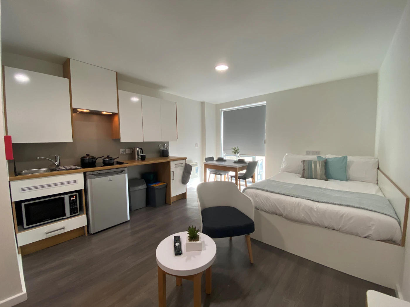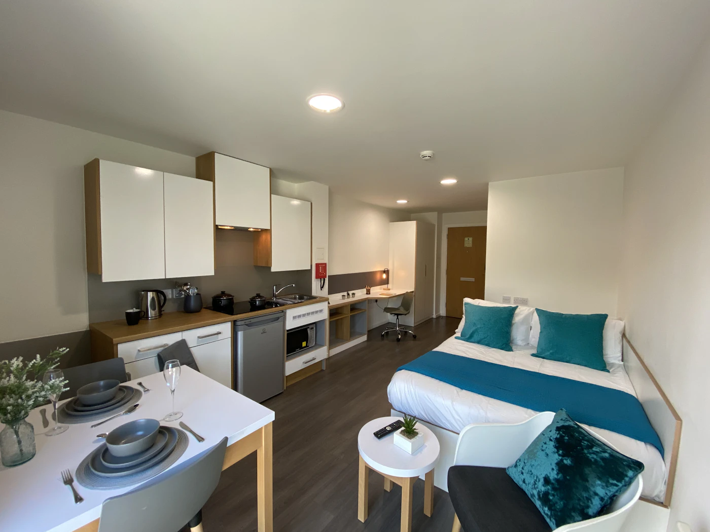 Self-contained kitchen, bathroom and living space Dual occupancy available 23.08-23.57m2 Double bed Desk chair and wardrobe provided