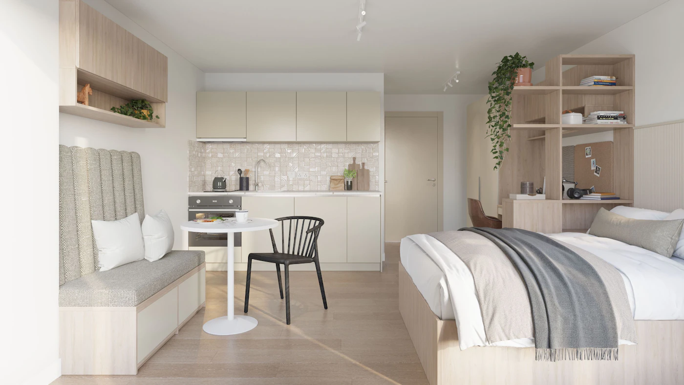 Self-contained kitchen, bathroom and living space Dual occupancy available 20-21.88m² Double bed Desk chair and wardrobe provided, Spacious and airy with high ceilings