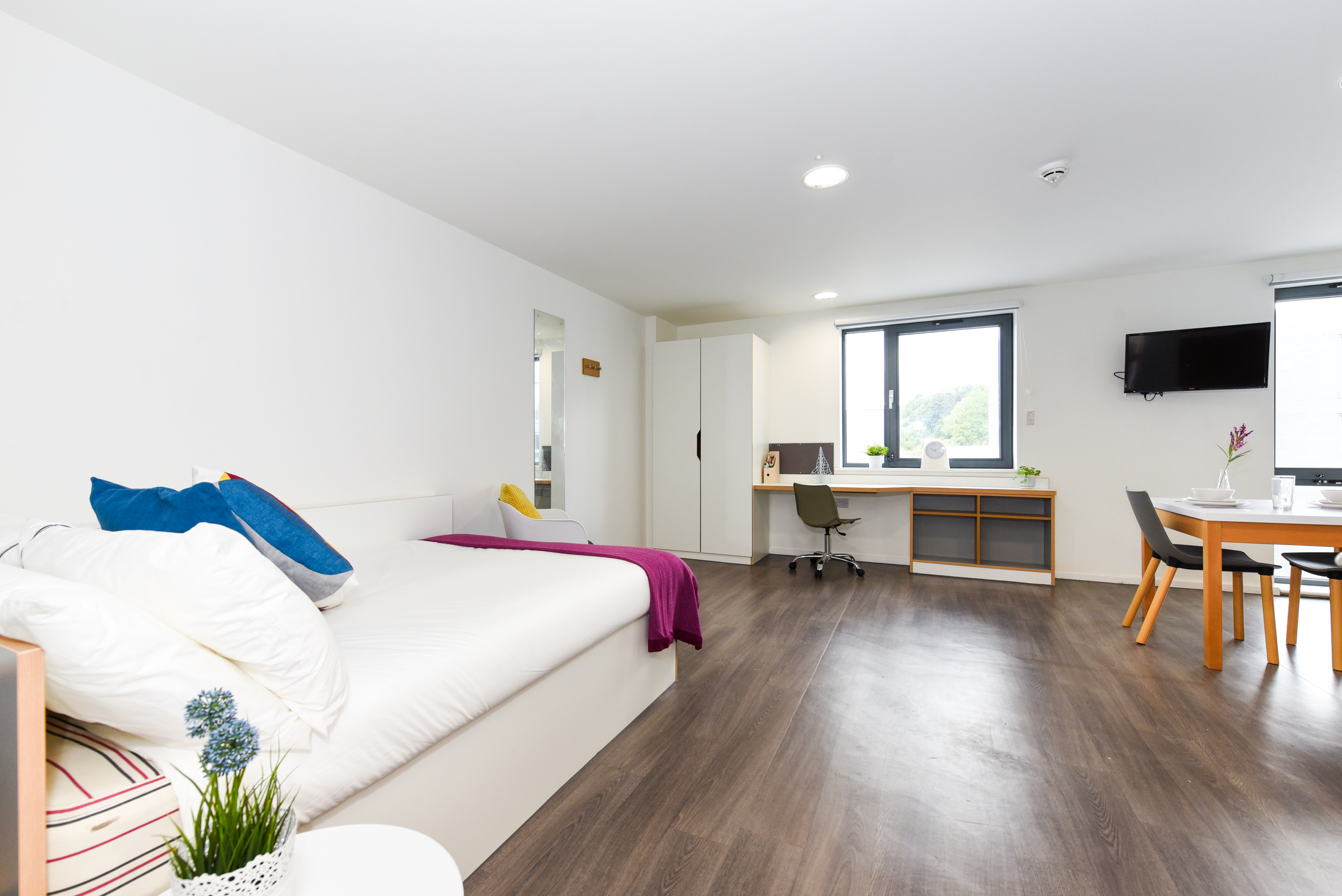 Self-contained kitchen, bathroom and living space Dual occupancy available 20-21.88m² Double bed Desk chair and wardrobe provided, Spacious and airy with high ceilings