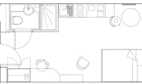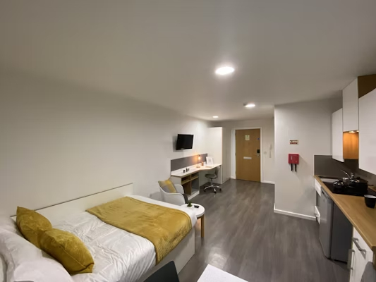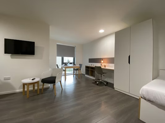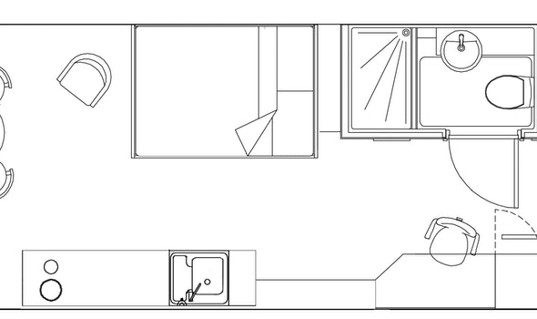 Self-contained kitchen, bathroom and living space Dual occupancy available 25.94-28.95m² Approximately Double bed Desk chair and wardrobe provided, Spacious and airy with high ceilings