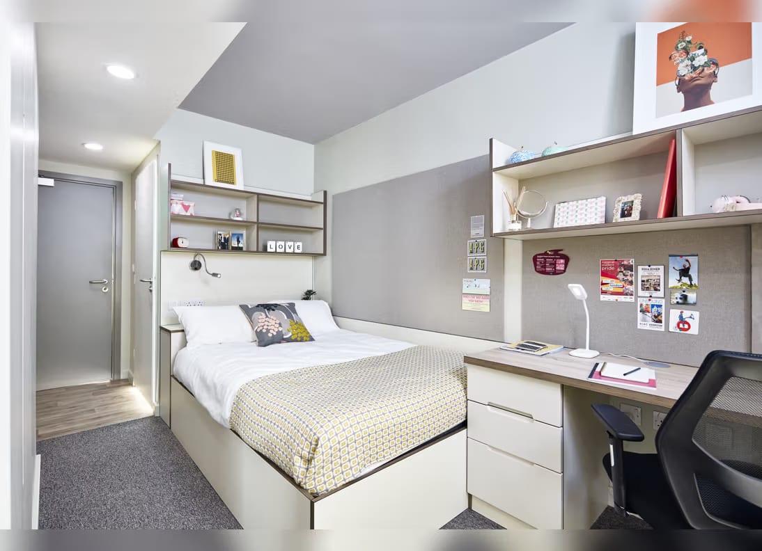 Starting university is a big step and we’re here to make sure your first home away from home is comfortable, practical, and great value. Thats why we’ve created this Fresher offer. Our Starter En-suite apartments are designed with new students in mind. Each flat includes a shared living space where you can relax, cook, and connect with your flatmates. You’ll have your own kitchen storage, including half a fridge and freezer, plus plenty of cupboard space for your snacks (and maybe even some veggies, balance is key!). Your private room comes with an en-suite bathroom, under-bed storage, blackout blinds for a good night’s sleep, and a super comfy mattress. The desk is set up for both left and right-handers, and you’ll find thoughtful touches like a full-length mirror with a plug socket underneath (perfect for hairdryers or straighteners), and USB ports by the bed so you can charge your phone or scroll in comfort.