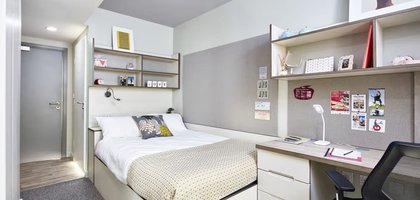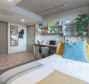 They say sharing is caring and we care about making your shared living experience the best it possibly can be. Our Bronze en suite apartments consist of 6 bedrooms and a communal living space where you can chill with your flatmates. Everyone within the apartment receives great storage space within the kitchen unit including half a fridge and half a freezer yourself. There are plenty of cupboards for all your snacks and hopefully your healthier options too (a balanced diet is a key to success!) Your room comes complete with an en suite bathroom, under-bed storage, black-out blinds to help you get a good night’s sleep, and a super comfortable mattress. The desk is designed to be comfortable for both left and right-handers. Other subtle but useful design features include a full-length mirror with a plug socket underneath to make it easy for you to use your appliances such as a hairdryer or straighteners when getting ready, plus sockets and USB ports at the head of your bed making it easy to charge your phone or use your laptop in bed.