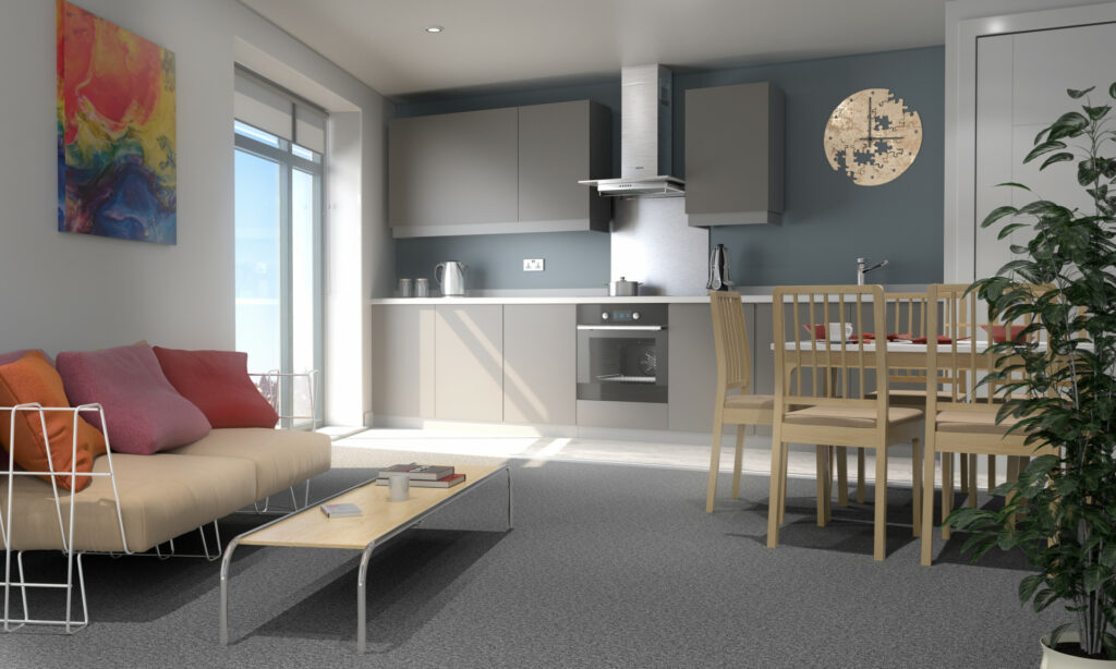 The en-suite bedrooms are arranged within apartments consisting of 3 to 5 units. Each cluster shares a fitted kitchen featuring oven, hob, extractors, fridge freezer, breakfast bar and seating in addition to a lounge area with sofas.