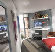 The standard en-suite bedrooms are arranged within apartments consisting of between 2 to 6 units. Each cluster shares a fitted kitchen featuring an oven, hob, extractors, fridge freezer, breakfast bar, and seating in addition to a lounge area with sofas. Room Details • ROOM SIZES 13-XX m2 • STUDY AREA • FITTED WARDROBES • ENSUITE WET ROOM BATHROOM • 3/4 BED • SAFE AND PERSONAL FRIDGE