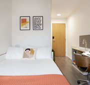 All our usual fab features set in a roomier setting – with a small double bed alongside the en-suite shower room, ample storage and sharing a kitchen/living room between 5-7 students.