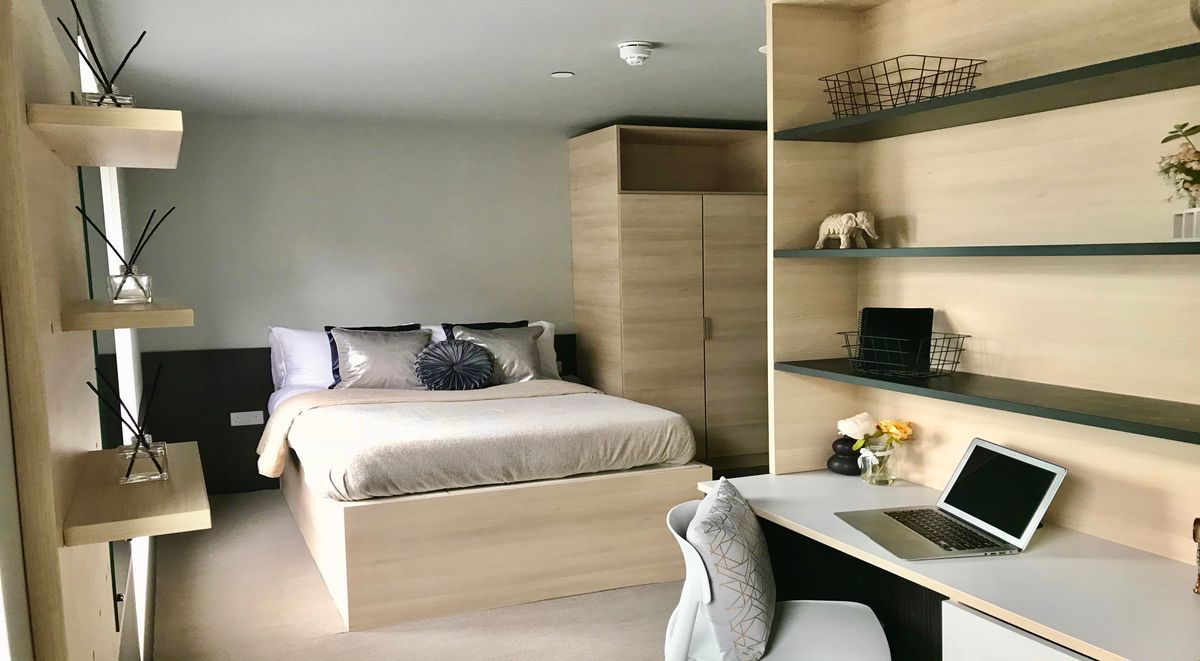 Premium Studio, which provides more space and a modern design for comfortable student living. These studios are available on multiple floors and include a comfortable 3/4 bed, a dedicated study area, and plenty of storage to keep your space organised. You’ll appreciate the convenience of a private en-suite bathroom and a fully equipped kitchen, ideal for self-sufficient living. The Premium Studio, with its spacious layout and stylish finishes, is an excellent choice for students looking for a balance of comfort, practicality, and the ability to personalise their space.