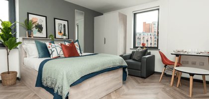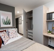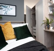 Significantly larger than our other En Suites, our Superior En Suite rooms come with between 14.5 - 18.5sqm of floor space! Located on floors 4 - 8, you’ll have a small double bed, loads of storage & workspace and your own en suite shower room. Get social in the shared kitchen and living space where you’ll be sharing with between 7-9 other people.