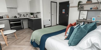 Presenting our Superior Studios, complete with a cosy small double bed, abundant workspace and storage, a private en suite shower room, and your personal mini-kitchen. Enjoy a floor space ranging from 24 to 26 sqm. These studios are perfect for solo living or sharing with a partner.