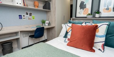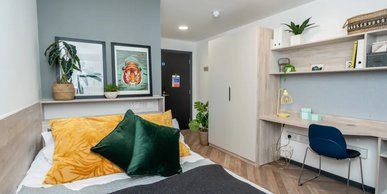 Located on floors 1 -3. Each of our Bronze En Suite rooms come with a small double bed, loads of storage & workspace and your own en suite shower room. Get social in the shared kitchen and living space where you’ll be sharing with between 7 - 9 other people.