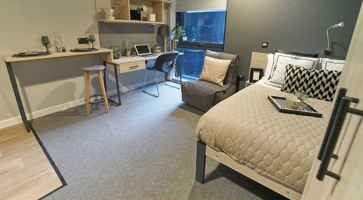 This luxury studio measures around 21-23m² and is located on the top floors offering views across the city. It comes with a 3/4 bed, study area contemporary fitted kitchenette and fully-fitted en-suite bathroom. You will have access to shared kitchen facilities and the amazing communal rooms.