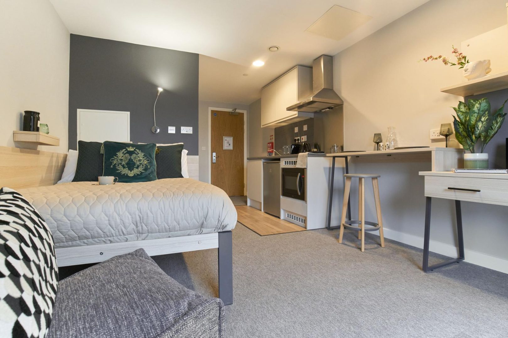 The Premium Studio is located on the top floors offering views across the city. It comes with a 3/4 bed, study area contemporary fitted kitchenette and fully-fitted en-suite bathroom. You will have access to shared kitchen facilities and the amazing communal rooms
