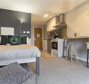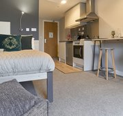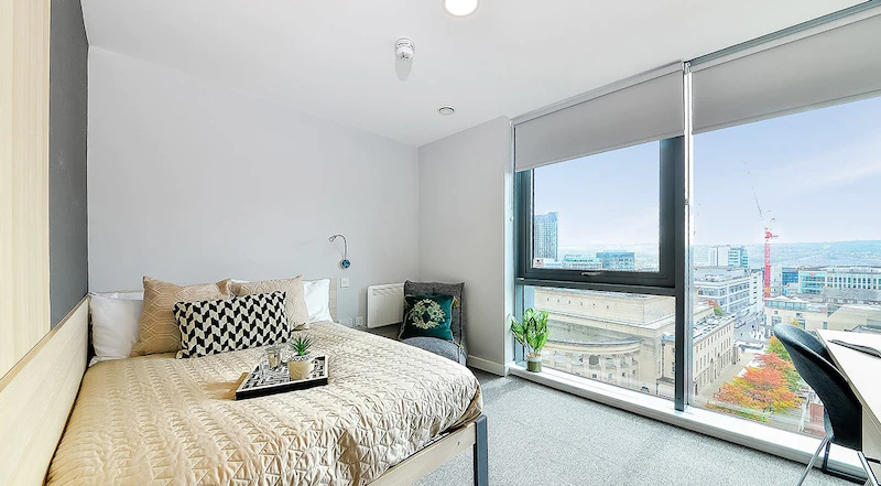 The Premium Studio is located on the top floors offering views across the city. It comes with a 3/4 bed, study area contemporary fitted kitchenette and fully-fitted en-suite bathroom. You will have access to shared kitchen facilities and the amazing communal rooms