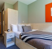 Our Premium Plus Studio style rooms feature a comfortable double bed, wardrobe, chest of drawers, study desk with wi-fi connection, en-suite bathroom, and fully equipped kitchen with a breakfast bar.