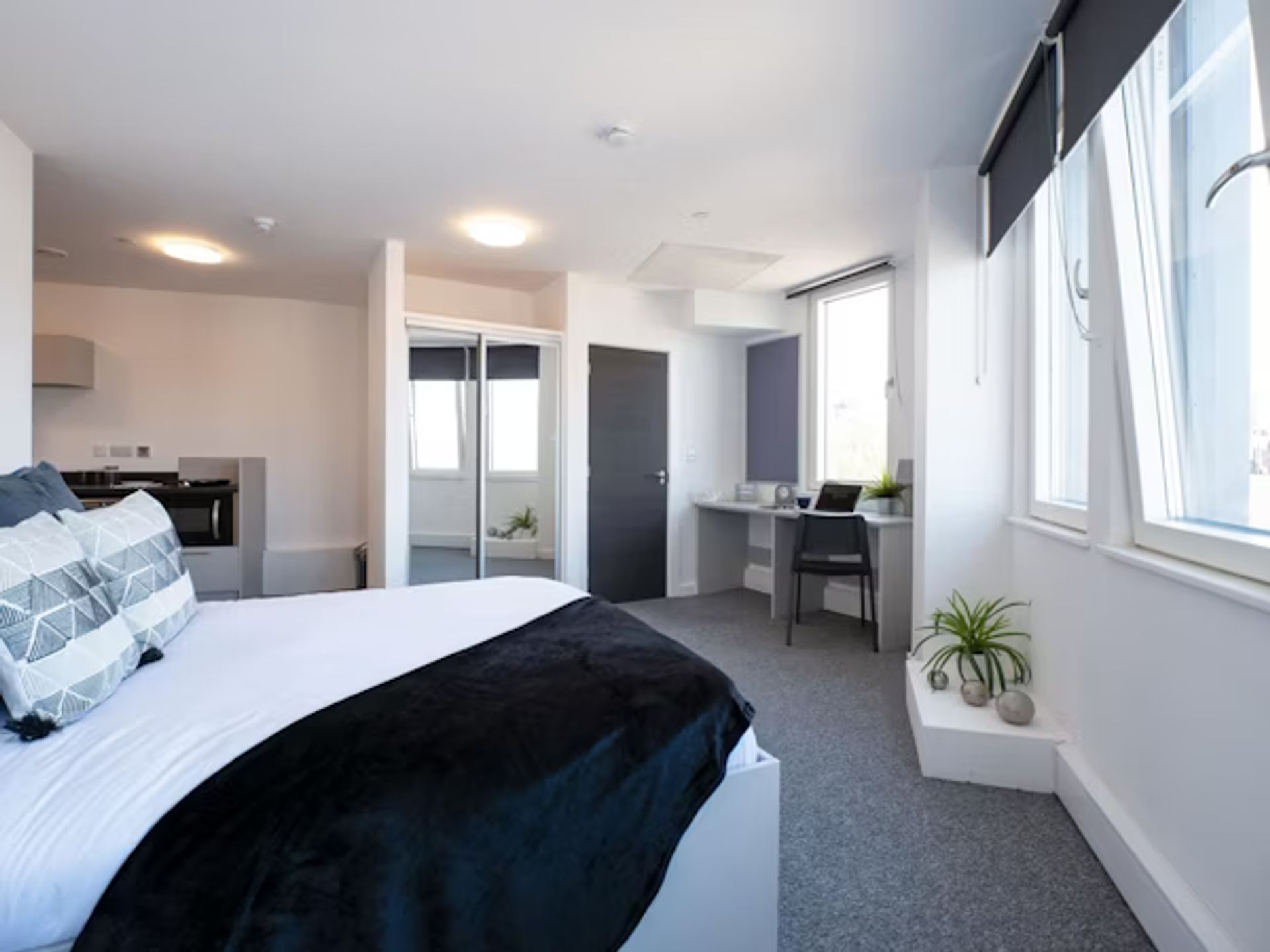 Experience spacious living in our Platinum Ensuite, available in sizes ranging from 28m to 35m. Enjoy a restful night’s sleep on the double bed with under-bed storage and cook up meals on the 2-ring hob with an extractor. Keep your wardrobe organized in the double wardrobe and freshen up in the en-suite bathroom. A full-length mirror, integrated fridge with a freezer compartment, microwave oven, and pinboard are all at your disposal. Study and work comfortably at the desk with ample drawer space and a chair.