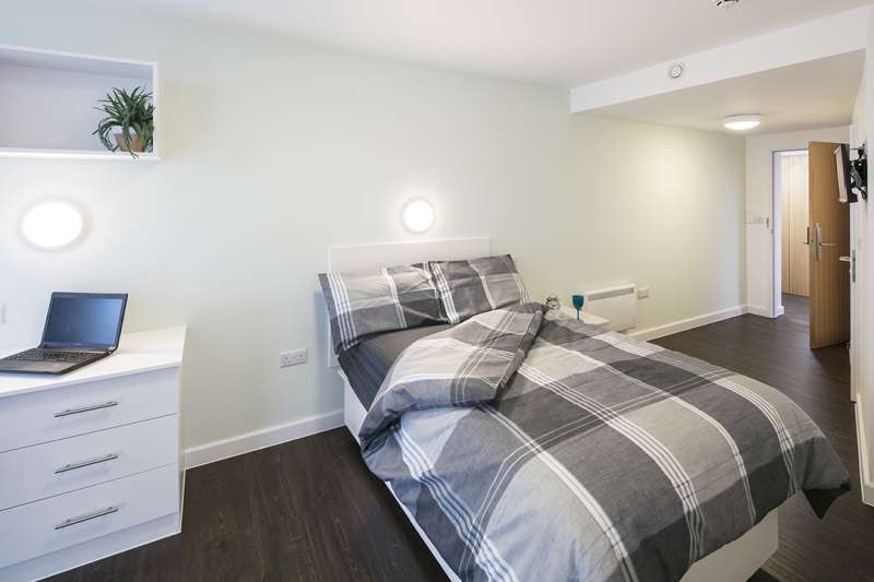 Your room comes with a three-quarter bed (which will fit a double bedding set just nicely) underbed storage, a wardrobe, drawers, study desk and chair and a shelving unit for all your books. You’ll also have the added benefits of a spacious en-suite bathroom with shower cubicle, sink and toilet and a fully equipped kitchen with flatscreen TV.
