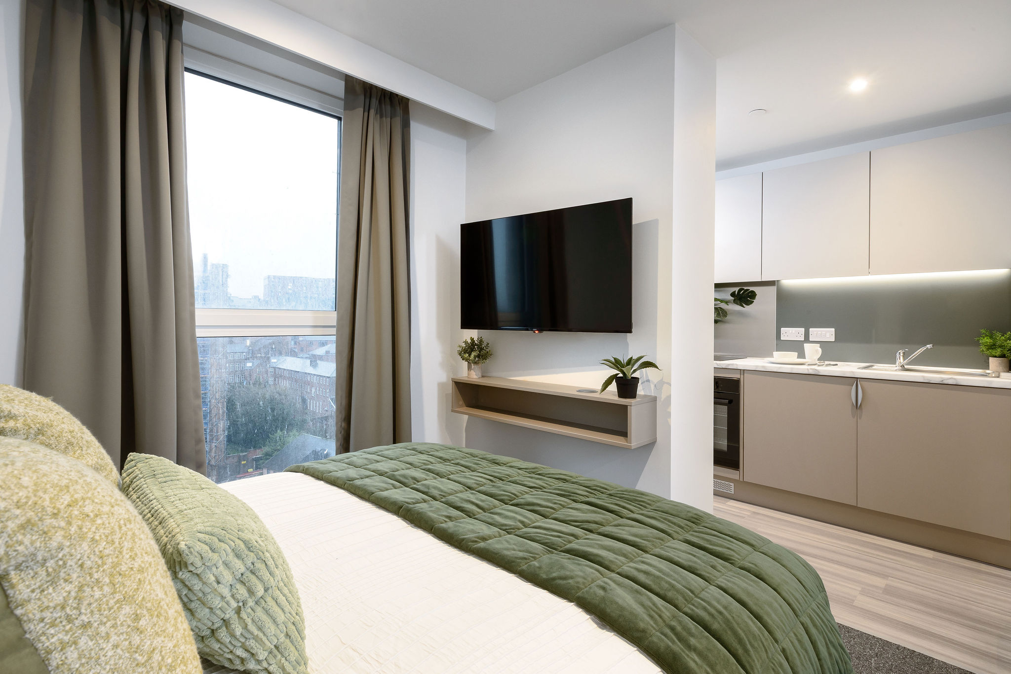 Our private student accommodation in Sheffield earns its 'true Sky Studio Plus' name as they are either more spacious than our typical true Studio rooms, or they are designed with your living experience in mind. Located on floors 21-26, these rooms have incredible views. Equipped with an en-suite, full-sized double bed, desk area, wardrobe and fully-fitted kitchenette, these rooms are the perfect home-away-from-home! Please note, images are for representative purposes and actual room design and layout may differ.