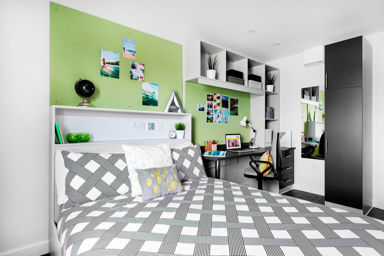Enjoy a stylish 11.5 – 12.sqm room in a 4 or 5 bed flat and benefit from all the storage you need, a small double bed, a bright en-suite shower room and 100Mb internet. Plus, socialise with your friends in your very own kitchen/living room.