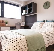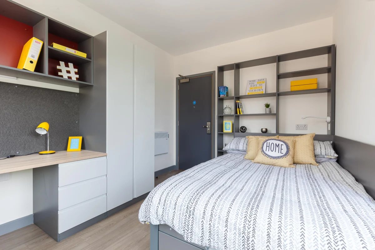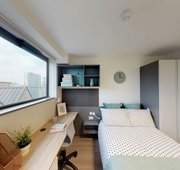Room Size: 9m2 - 10m2 3/4 size bed Double wardrobe, book shelves and under-desk storage Large shared communal space with fitted kitchen Secure shared toilet and bathroom (One between two)