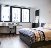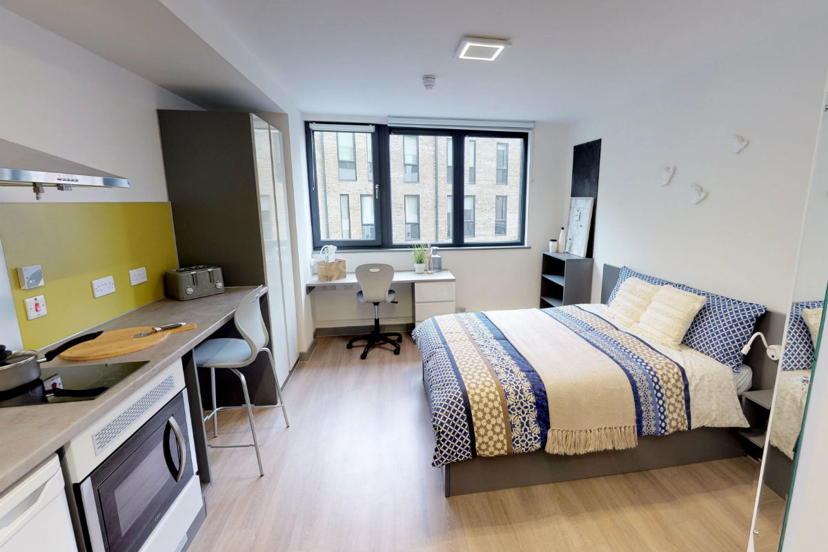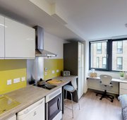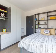 Spacious room with large en-suite. Kitchenette with breakfast bar, ceramic hobs, combi oven and fridge/freezer. Room size can vary from 18.6 - 19.4m2. ¾ size double bed with under bed storage Private en-suite shower room 2 ring ceramic hob Fully fitted kitchen Combination oven, microwave & grill Breakfast bar and stool A study desk and desk chair Double wardrobe Bookshelves Drawers Plenty of storage space Private room access Private kitchen