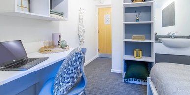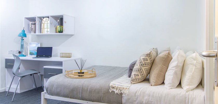 This welcoming bedroom has a single bed, wardrobe, desk and chair, sink and vanity unit and is within a seven-bedroom cluster flat, featuring a spacious and modern, shared living and kitchen area, equipped with a cooker, combi microwave, fridge, freezer and a dishwasher. You will also have access to two toilets and a shower. The size of the bedroom is 9m²