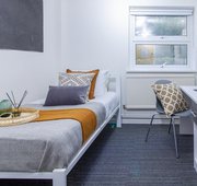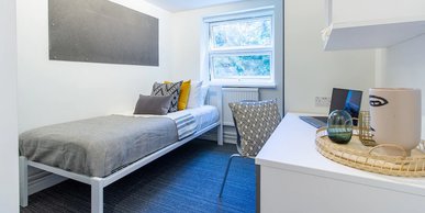 This cosy bedroom has a single bed, wardrobe, desk and chair, sink and vanity unit and is within a seven-bedroom cluster flat, featuring a spacious and modern, shared living and kitchen area equipped with a cooker, combi microwave, fridge, freezer and a dishwasher. You will also have access to two toilets and a shower. The size of the bedroom is 10.5-11m².