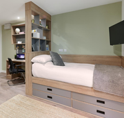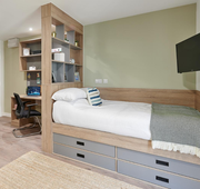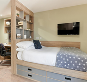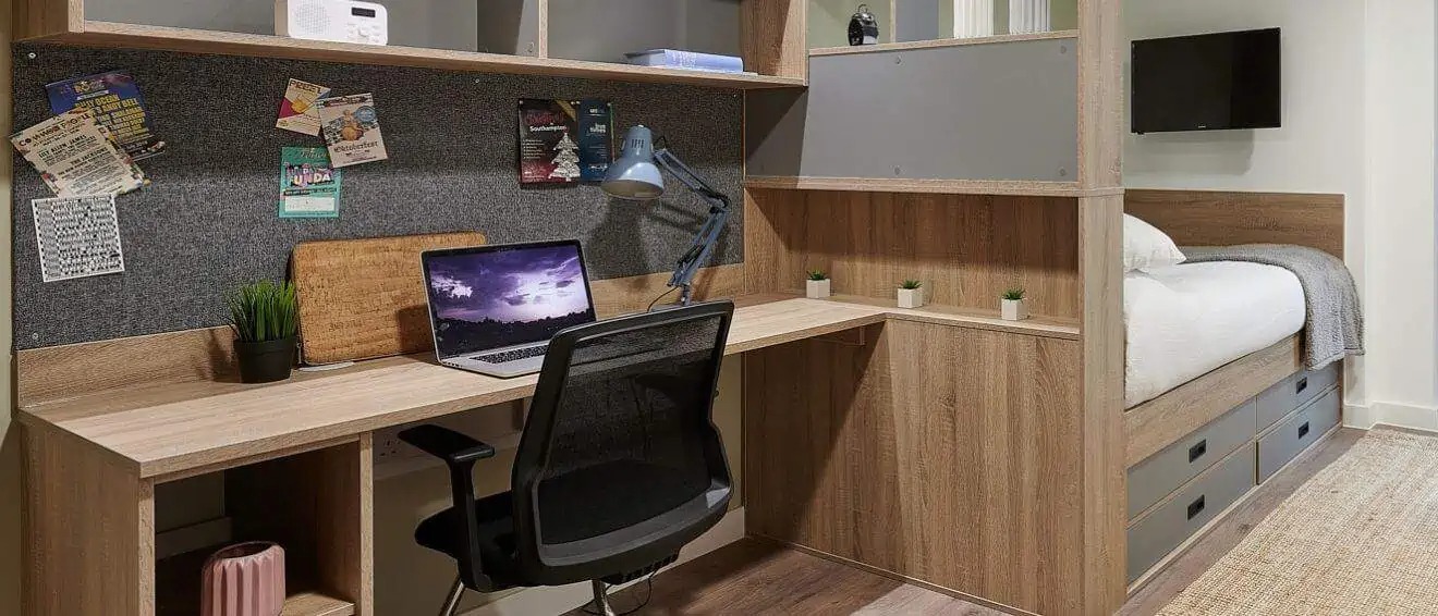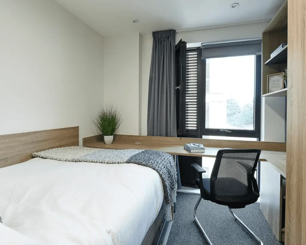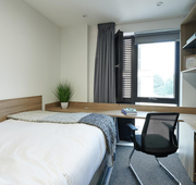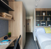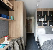 Room Size - 13.5 m² 3/4 double bed Large desk and chair Spacious wardrobe Drawers Bedside table Underbed Storage Bookshelves The amenities. Shared kitchen Bathroom En-suite Appliances - Microwave, toaster, kettle Appliances - Dishwasher - only in 6-bed flats Kitchenware - Cutlery, crockery, glasses Free wired internet (200Mb) Free Wi-Fi (up to 100Mb shared) Shared Freeview TV