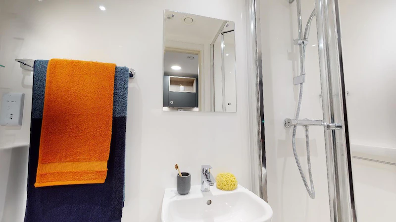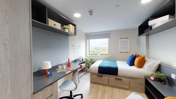 Each bedroom measures 20m2, you’ll find your own small double bed with underbed storage, private en-suite shower room, designated study space and a fully fitted kitchen with a dining area.