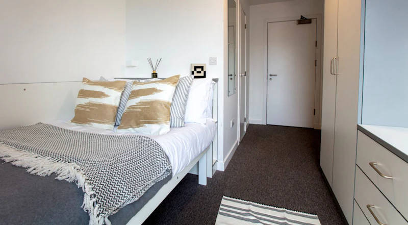 Experience our spacious 27-30-square-metre room, featuring a comfortable ¾ bed, dedicated study area, and wardrobe space. Gather in the communal lounge with fellow residents to watch TV and unwind. Utilise the shared kitchen for culinary adventures and enjoy seamless connectivity with 100Mbps WiFi accessible across the building.